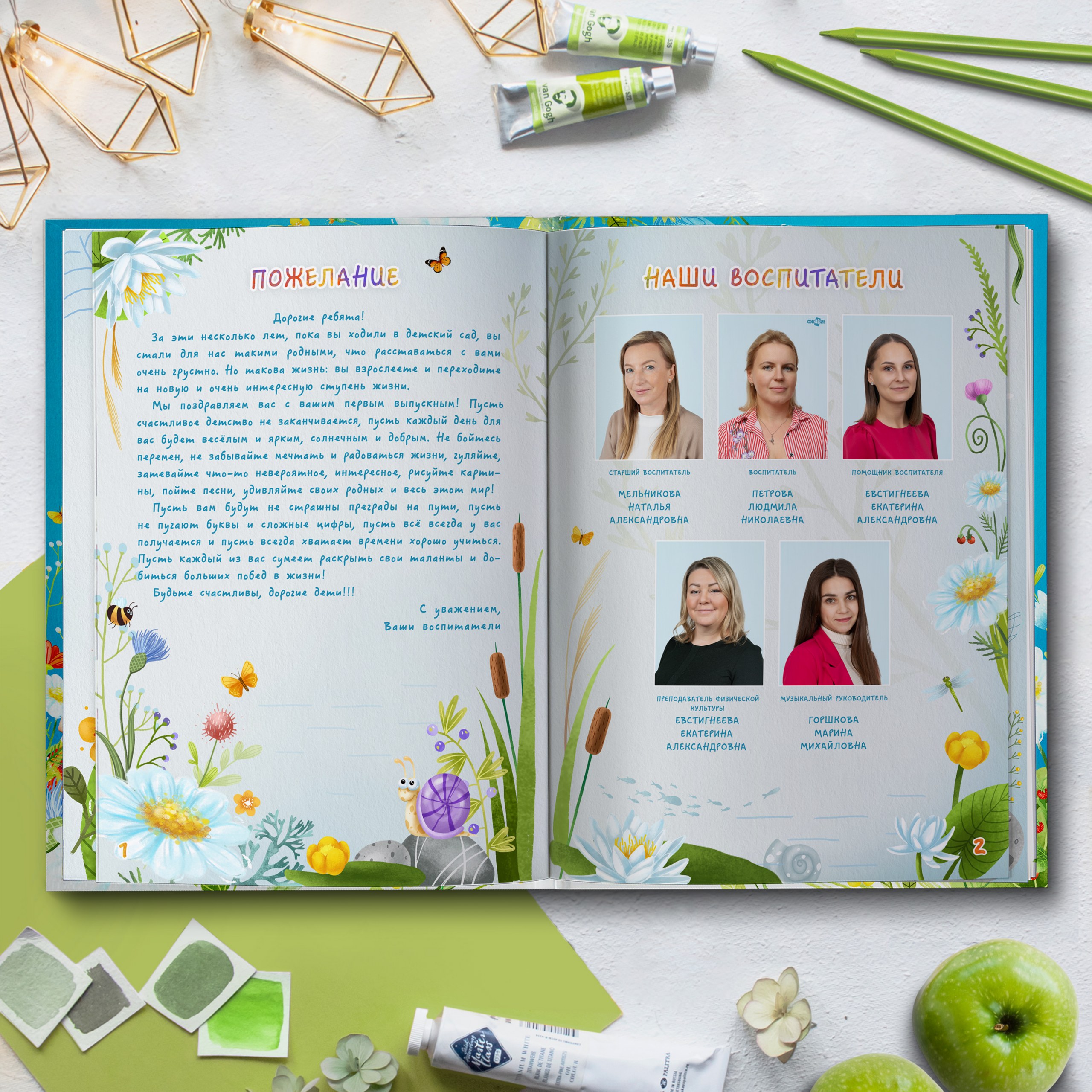1ый разворот — напутственное слово воспитателя и виньетки педагогов