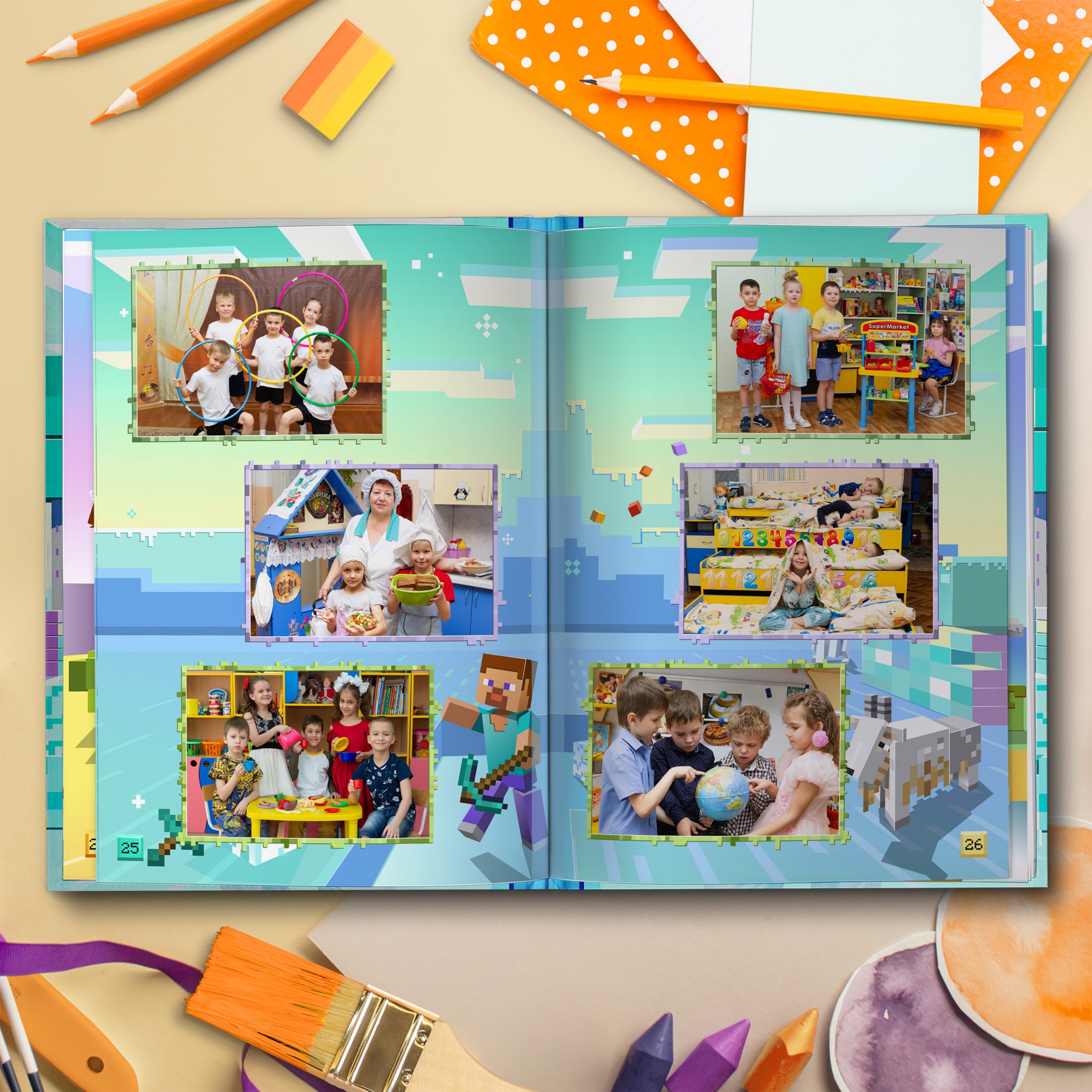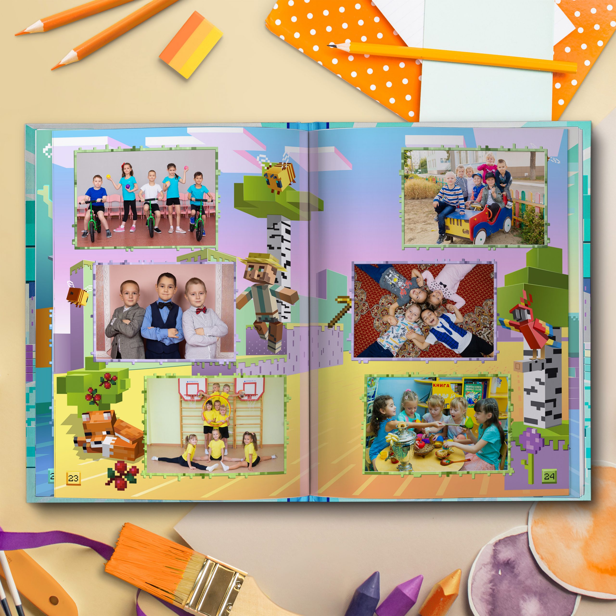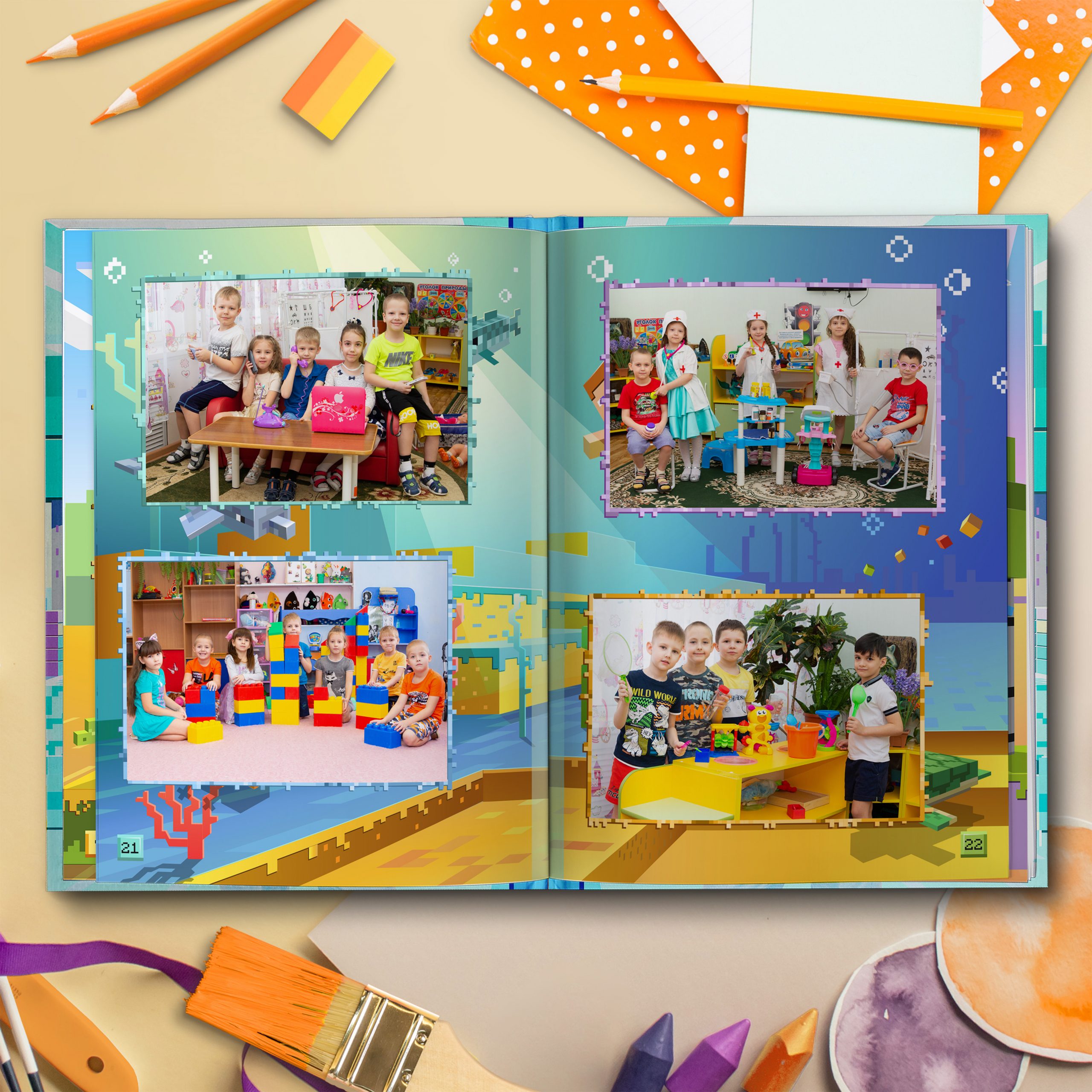 Выпускной альбом для детского сада создан по мотивам всеми любимой игры Майнкрафт, где каждый выпускник будет в полном восторге от возможности переместиться в мир кубиков. Он имеет в своём арсенале две разные обложки. И как игра Майнкрафта превращает каждого ребенка в создателя и творца, так и альбом «Пиксель» вдохновит маленьких выпускников на свои важные первые победы и достижения.