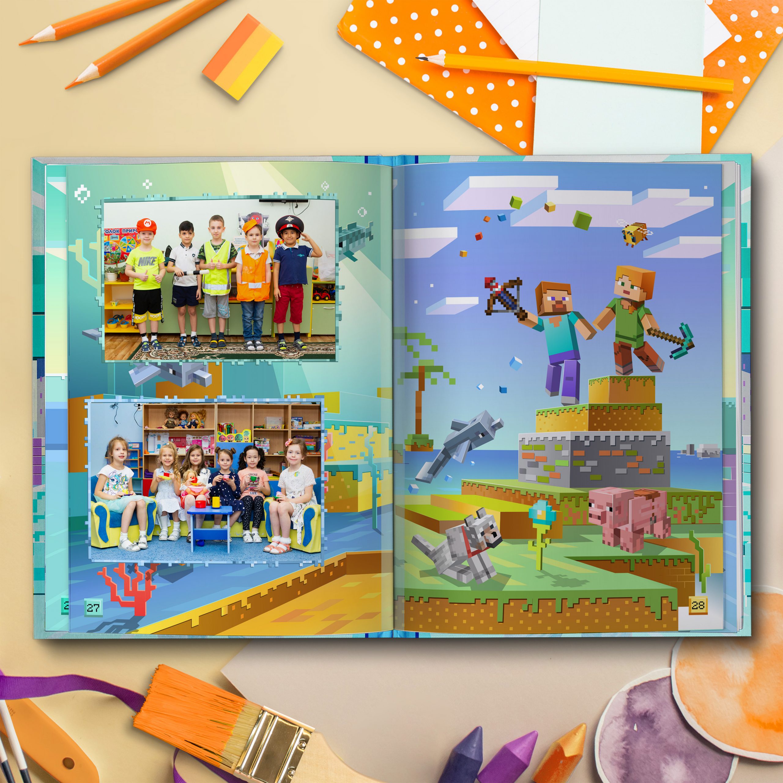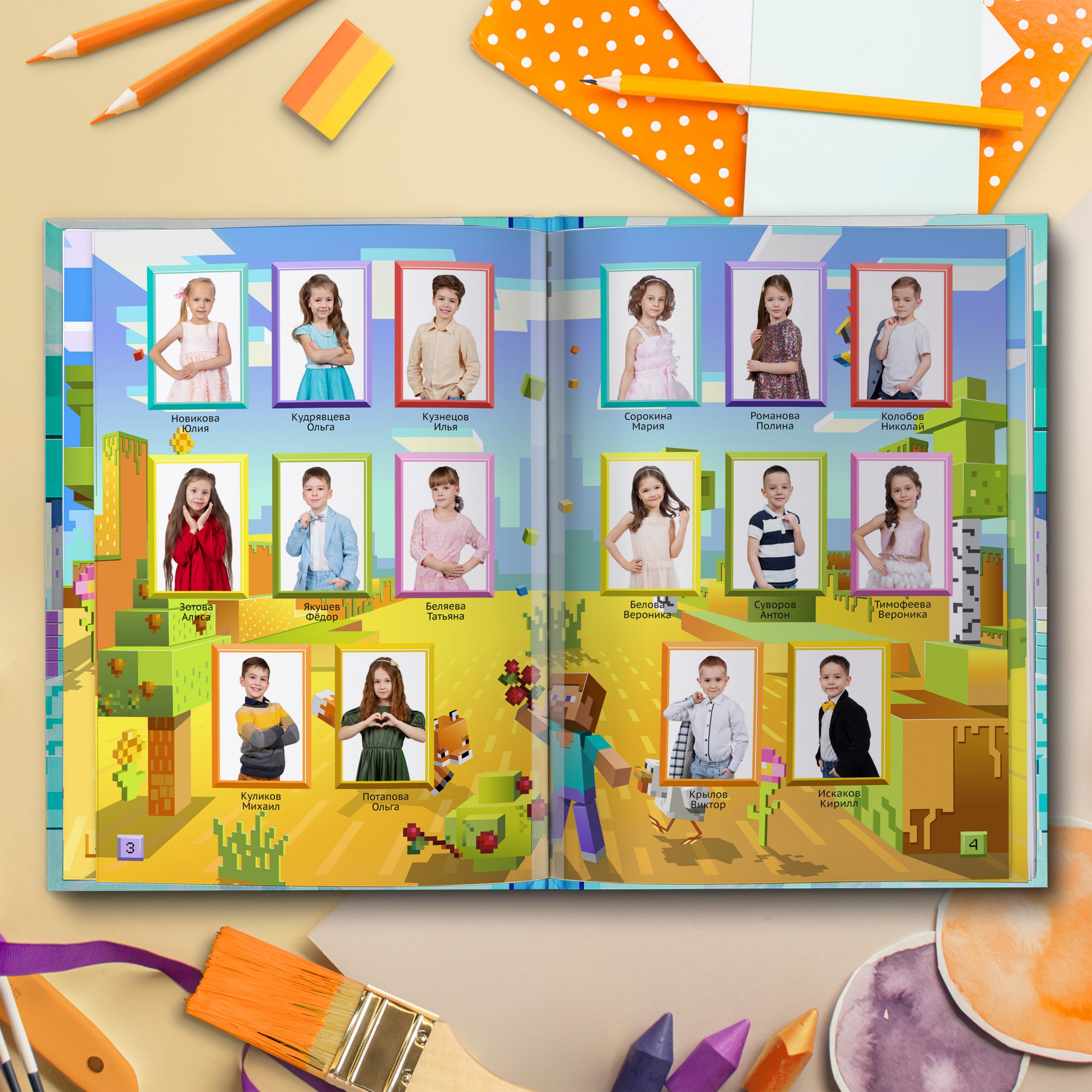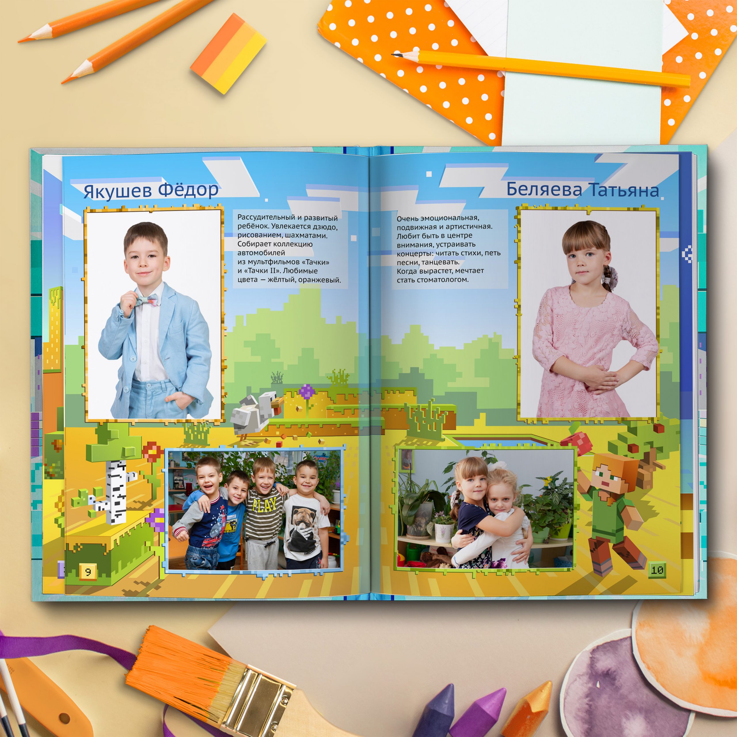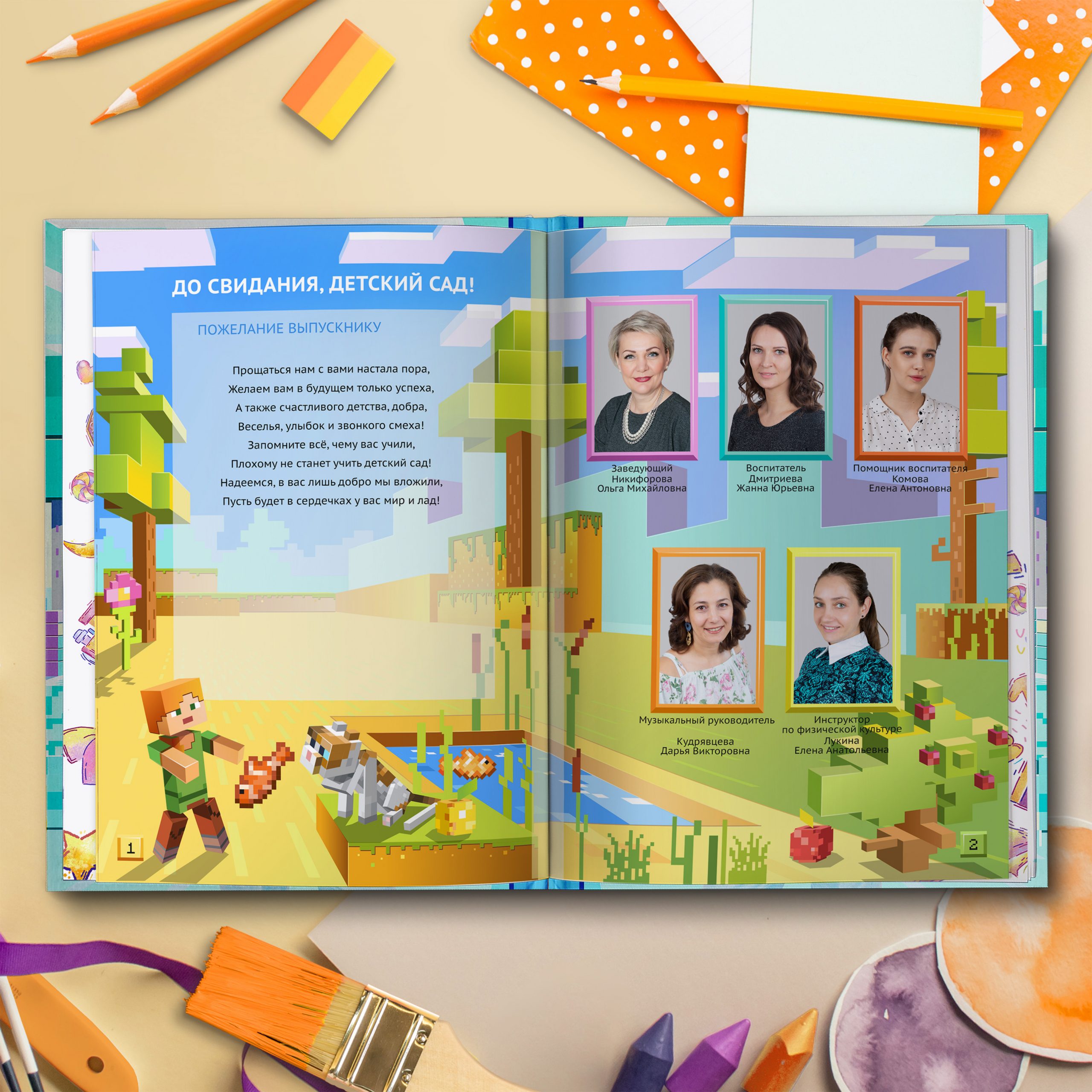 Выпускной альбом для детского сада создан по мотивам всеми любимой игры Майнкрафт, где каждый выпускник будет в полном восторге от возможности переместиться в мир кубиков. Он имеет в своём арсенале две разные обложки. И как игра Майнкрафта превращает каждого ребенка в создателя и творца, так и альбом «Пиксель» вдохновит маленьких выпускников на свои важные первые победы и достижения.
