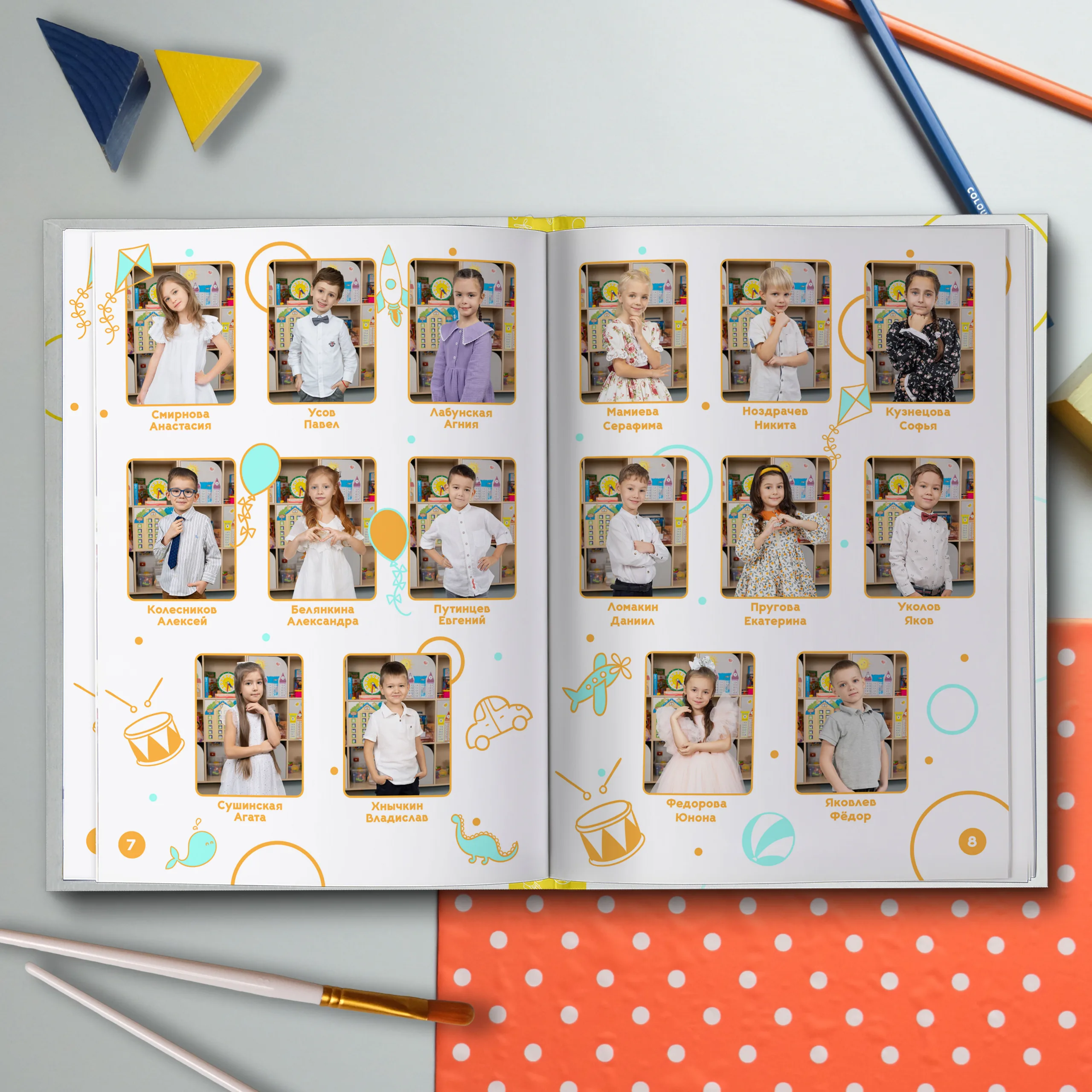 3ий разворот и далее — личные страницы выпускников (портретная фотография и 2 фотографии личного репортажа)