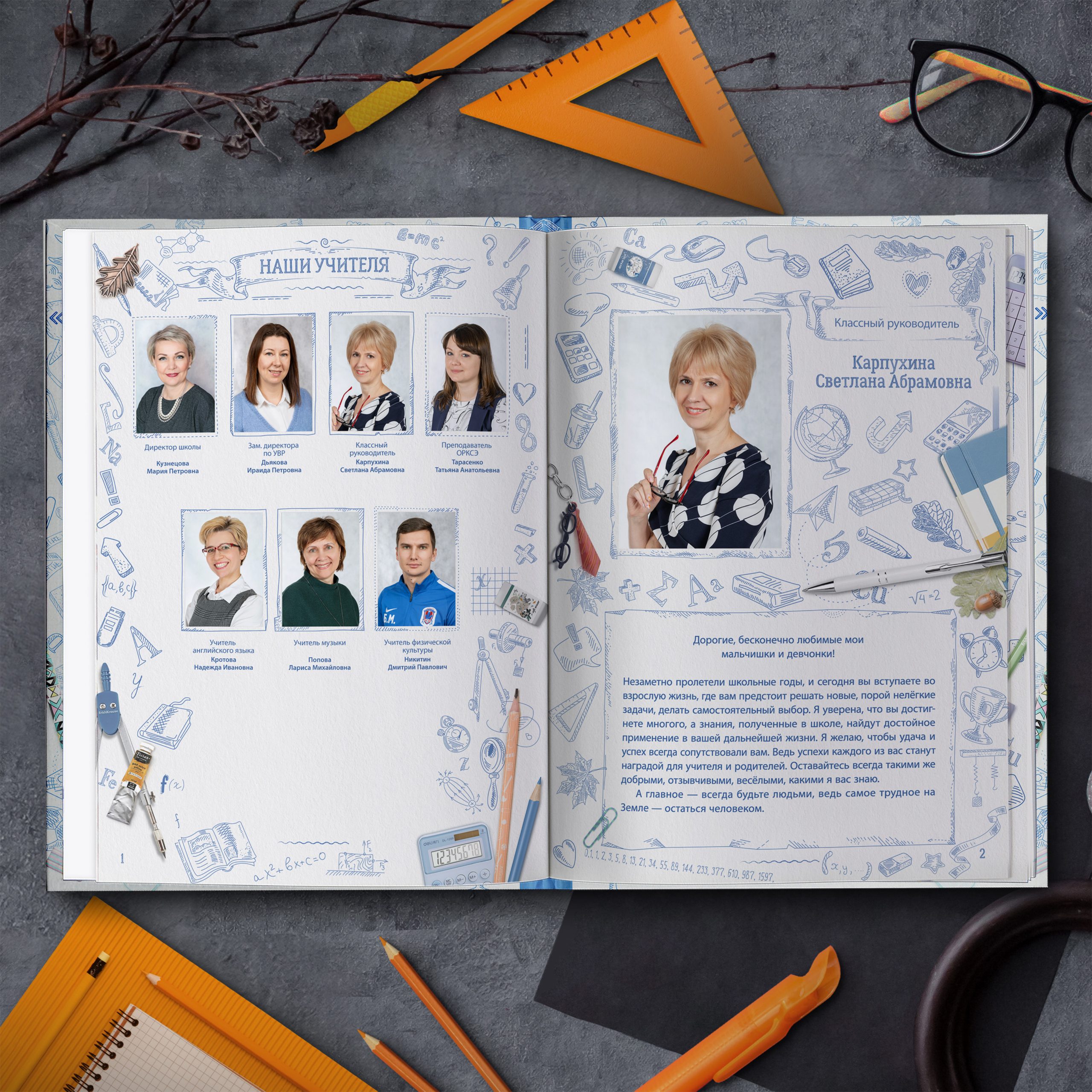 1ый разворот — виньетки педагогов и фотография классного руководителя с напутственным словом