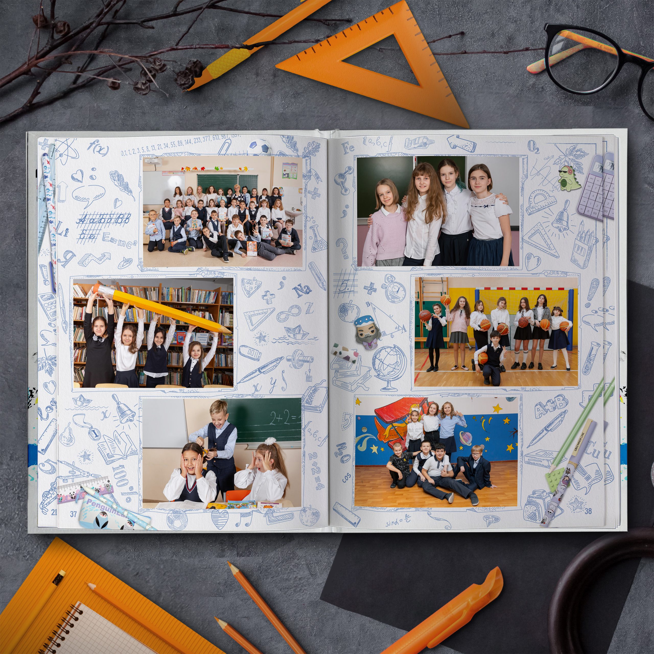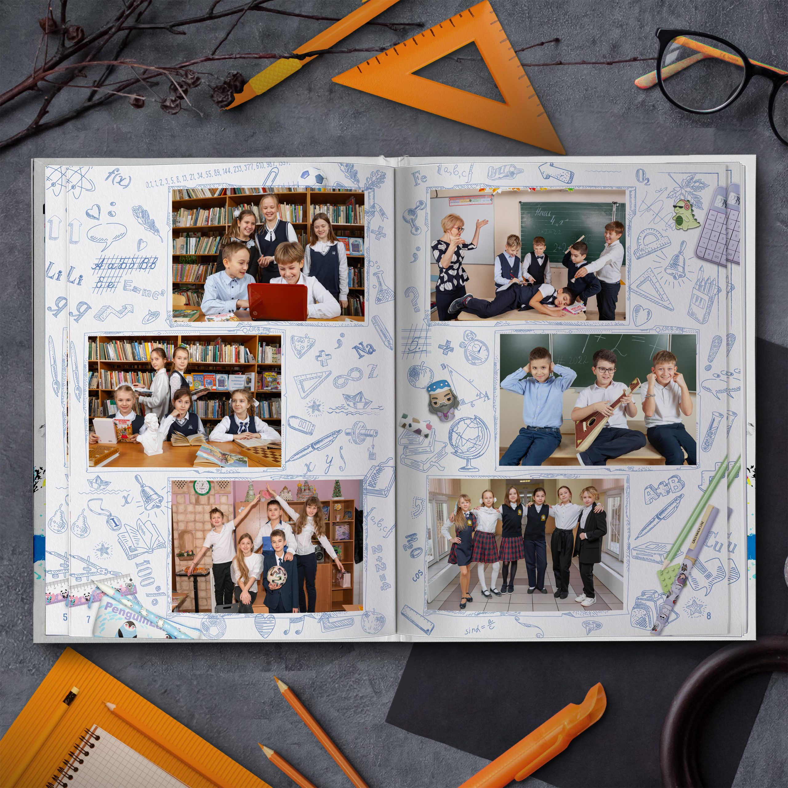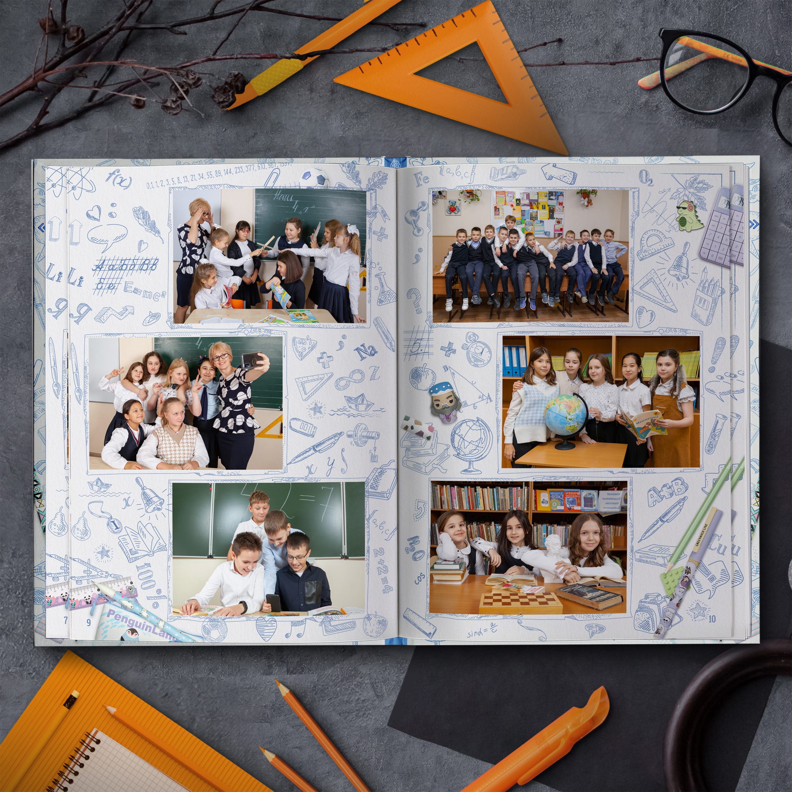 Полюбившийся многим дизайн теперь в светлом оформлении. Яркие кадры юности на фоне, напоминающем изрисованную тетрадь, непременно окунут выпускников в приятные воспоминания. Выпускной альбом в классном современном дизайне не оставит равнодушным ни одного ученика.