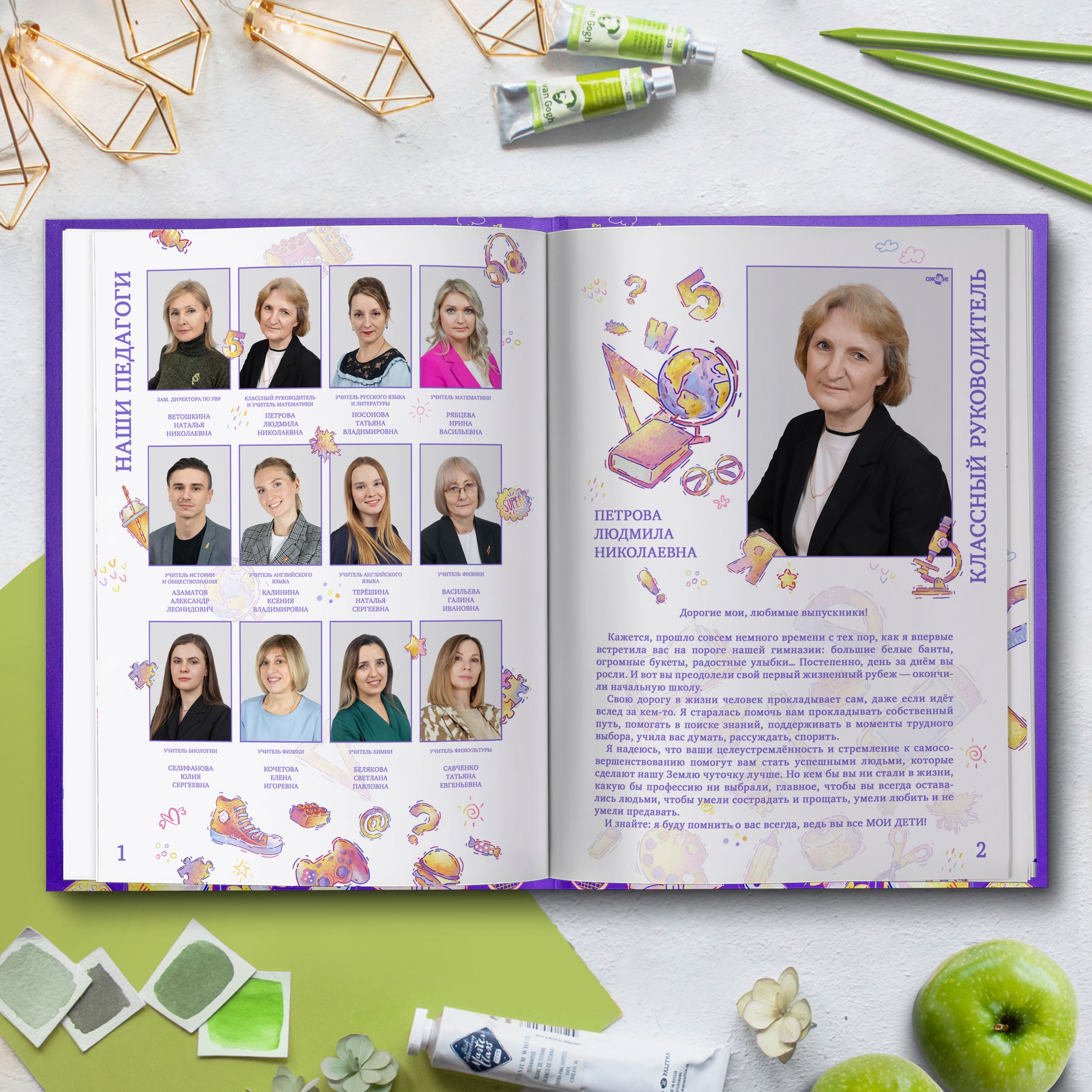 1ый разворот — виньетки педагогов и фотография классного руководителя с напутственным словом