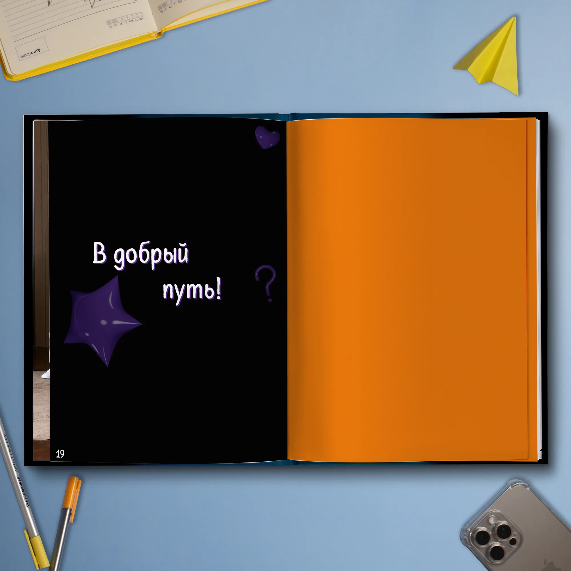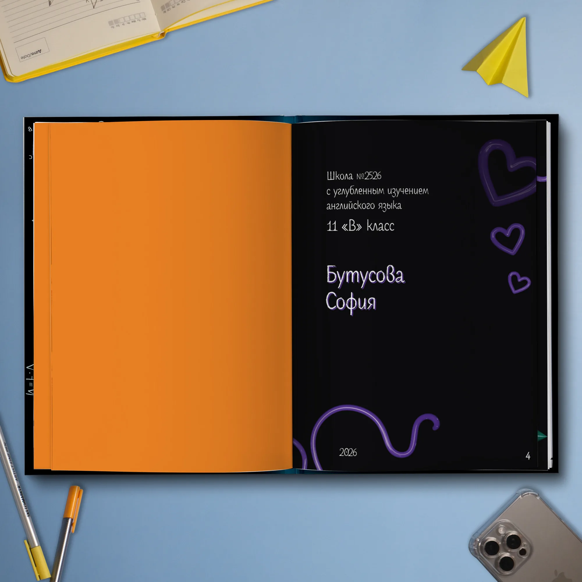 1ый разворот — оранжевый форзац из дизайнерской бумаги