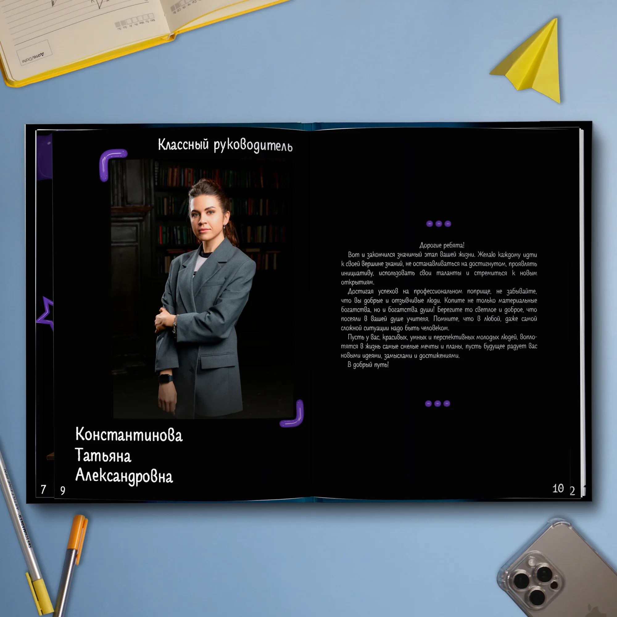 1ый разворот — фотография классного руководителя с напутственным словом